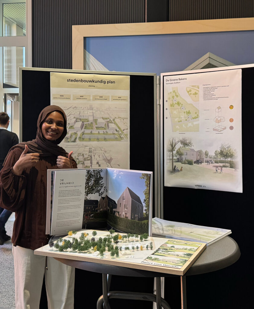 Tijdens de bedrijvenmarkt bij de Hanze gingen studenten en bedrijven met elkaar in gesprek over het werkveld, stages tijdens de studie en de mogelijkheden daarna. Met een maquette, posters, presentatieboekjes en een presentatie aan eerstejaars studenten gaven Dennis Hofstee en onze stagiaire Aceel El Nour een inkijk in ons werk en onze manier van ontwerpen.