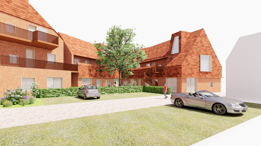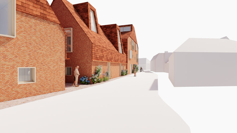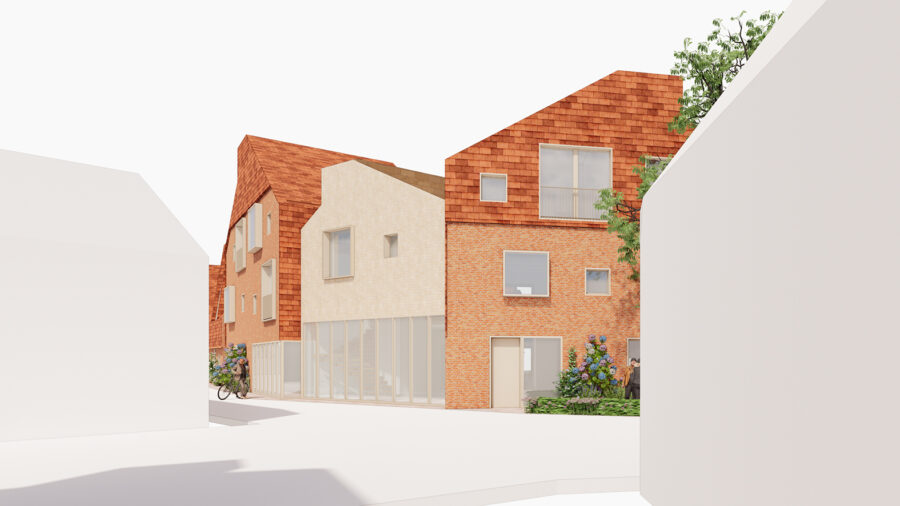 De materialisatie sluit aan bij de omgeving: rood metselwerk en rode leipan vormen de basis. Elk pand krijgt een eigen karakter in detaillering en uitwerking, maar samen vormen de volumes duidelijk één familie. Zo ontstaat samenhang zonder eentonigheid.