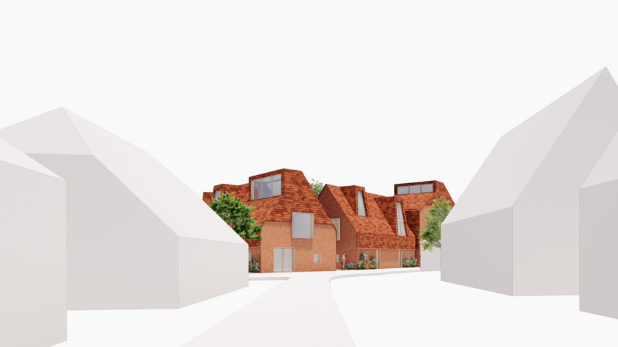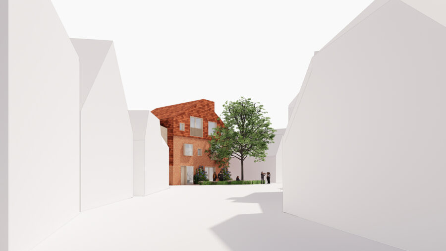 In dit plan boetseren we de gebouwen letterlijk op hun plek. Geen massief blok, maar losse volumes die zich voegen naar hun context. Richting de rode woonwijken houden we de schaal lager en intiemer. Richting het centrum mag het gebouw iets hoger zijn. Zo ontstaat een natuurlijke overgang tussen buurten. Er ontstaat een spel van volumes en daken met een vriendelijke uitwerking in het straatbeeld: dansende daken.